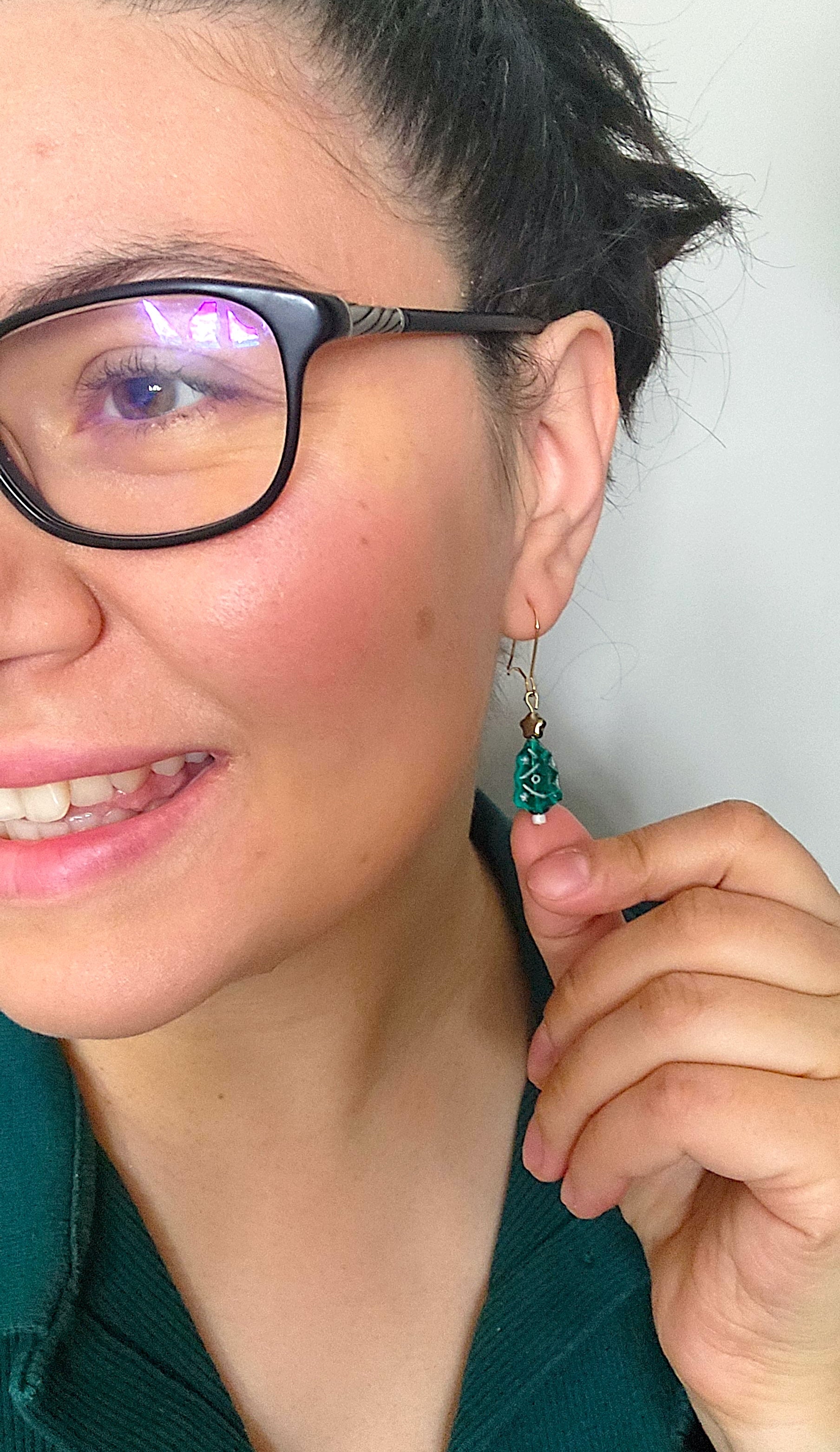 Celebrate the magic of the season with these handmade Christmas tree earrings, crafted with rich green lampwork glass beads and finished with 18K gold-plated hooks. Each glass tree is individually shaped and detailed, making every pair truly one of a kind.